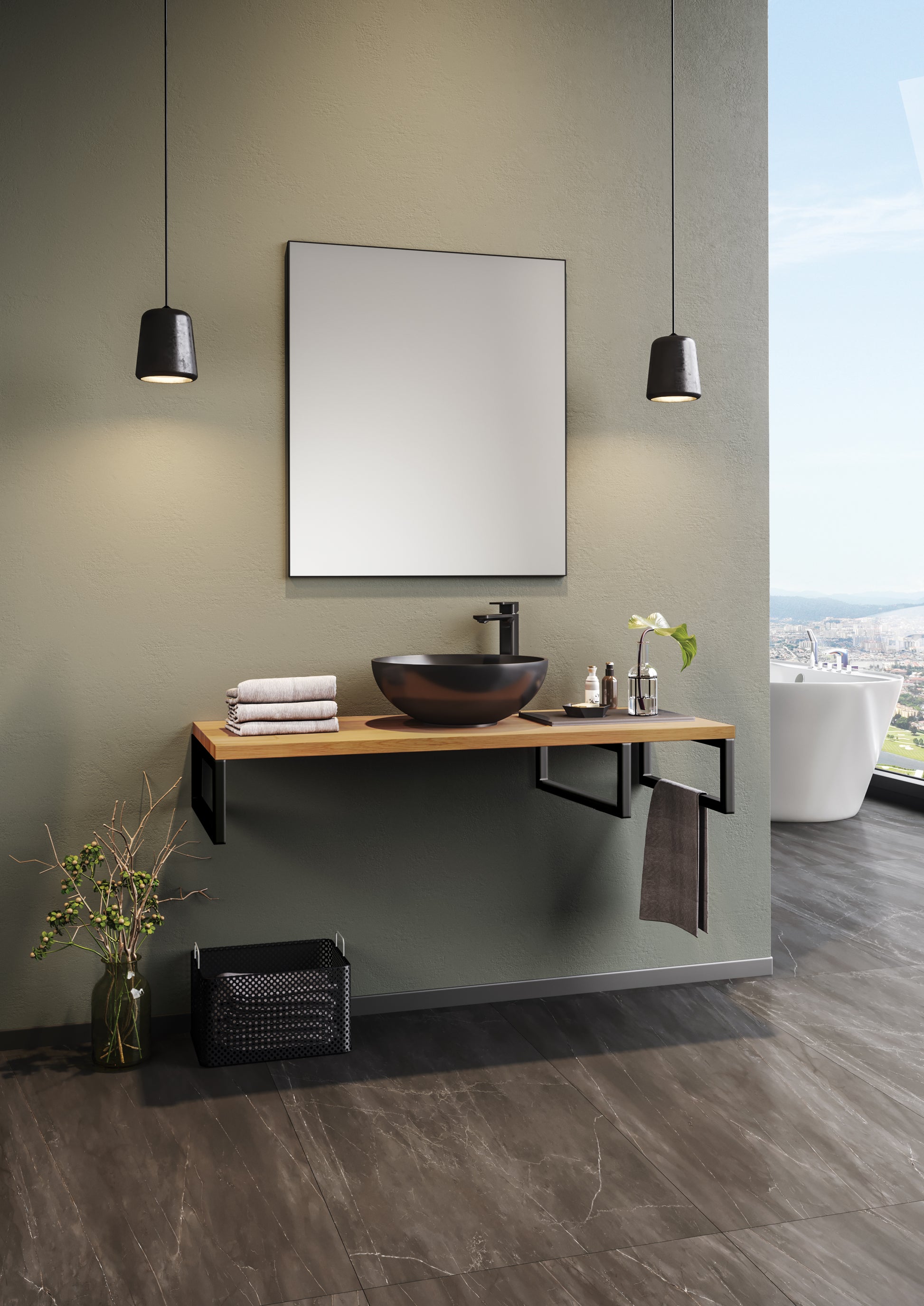 Das Kestel Set beinhaltet einen Unterschrank mit aufgesetzten Waschbecken und einen dazu buchbaren Spiegel.